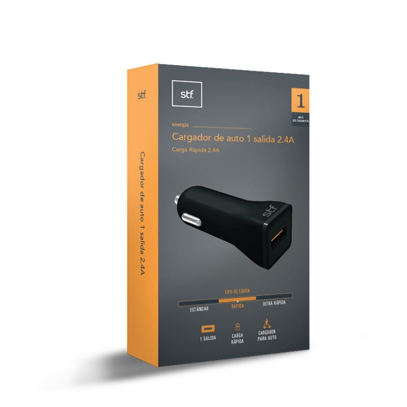 Este cargador STF para auto facilitará la carga de tus dispositivos. Tiene salida a 2.4A para que conectes tu dispositivo y cargarlo en cualquier lugar. La compatibilidad USB te dejará conectar cualquier cable y que nunca te quedes sin batería, a donde sea que vayas.