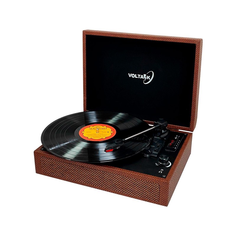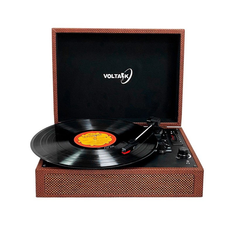 Escucha tus Lps en esta tornamesa Voltak de 3 velocidades 33 13 45 78, que también cuenta con reproductor y transmisión bluetooth. Tiene entrada auxiliar de 3.5 mm, entrada de auriculares de 3.5 mm y salida RCA.