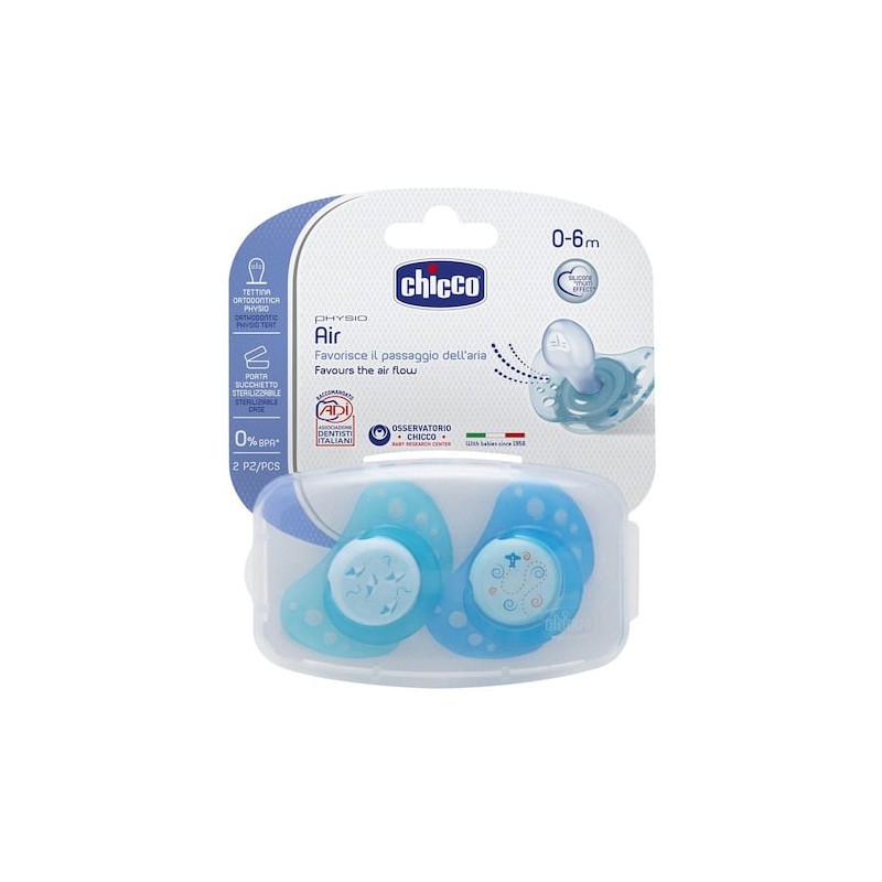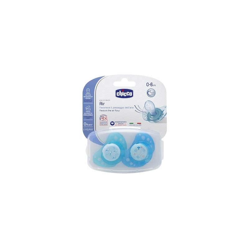 Chupones Physio Air diseñados para ofrecer una máxima ventilación a la piel del bebé Su tetina ortodóntica Physio Active favorece el correcto desarrollo de la boca del bebé promueve el posicionamiento natural de la lengua y distribuye la presión sobre el paladar, para un correcto desarrollo oral. Base súper delgada, para el cierre óptimo de la boca.
