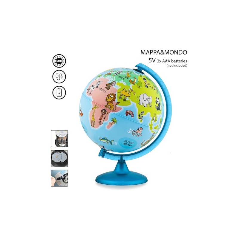 Dale la vuelta al mundo en un día? Globo terraque Mapa Mundi con el que puedes aprender y conocer muchas curiosidades y peculiaridades ideal para apendizaje en niños mayores de 8 años , mide 25 cm con luz en su interior. La esfera gira sobre su eje. actualizado en Castillano y tiene características dobles, cuando la luz está apagada, la esfera Tiene un pedestal color asul y medio meridiano de metal recubierto de latón. Altura del producto 25. Se suministra bombilla led. Equipo eléctrico utiliza cable usb 3 pilas AAA no incluidas Hecho en Italia, material plástico y metal.