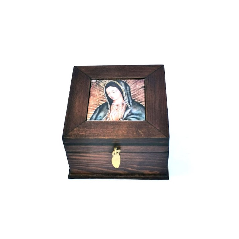 Elaborada en madera de pino y decorada con la imagen de la Virgen de Guadalupe que va cubierta con resina fotográfica lo que hace que la imagen se conserve y luzca brillante, la imagen mide 3x3 cm.