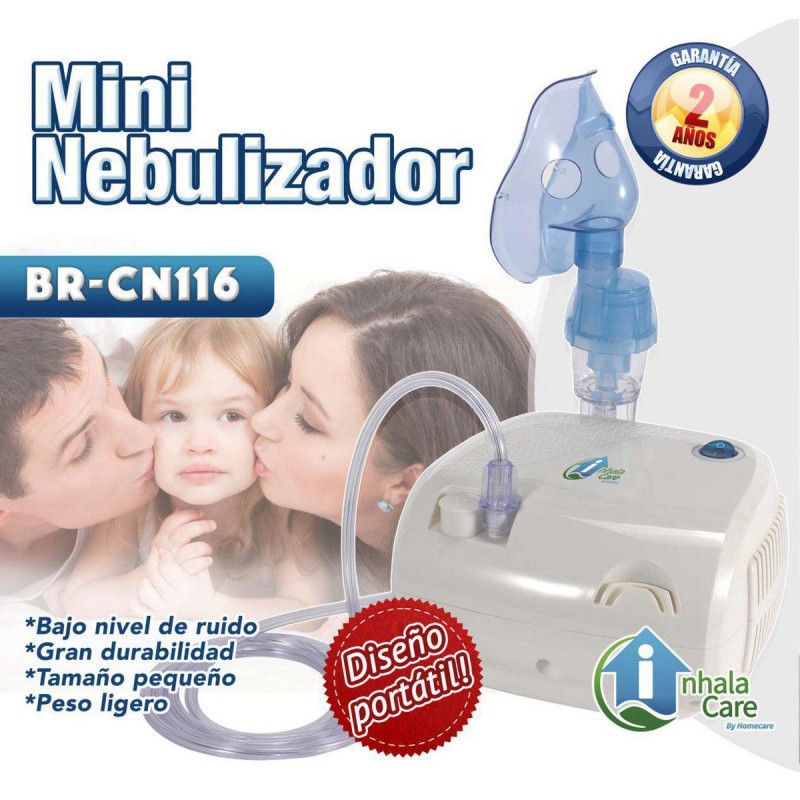Nebulizador Nebcare. Inhalacare by Home-Care. Diseño con agarradera para transportarlo a cualquier lugar. Con compartimento para guardar los accesorios del nebulizador. Administración médica eficaz. Operación con un solo botón. Funcionamiento silencioso. Terapia respiratoria eficiente y eficaz. Garantía de 2 años. Potencia 120V60Hz. Capacidad de medicamento 6.0 ml. Tamaño de la partícula 0.5-8um. Nivel de ruido 55 dBA. Peso 2.0 Kg. ACCESORIOS Mascarilla infantil y adulto. vaso dosificador. boquilla. tubo de aire de PVC. 5 filtros de aire. Bolsa para traslado. Cuenta con FDA. ISO y CE.
