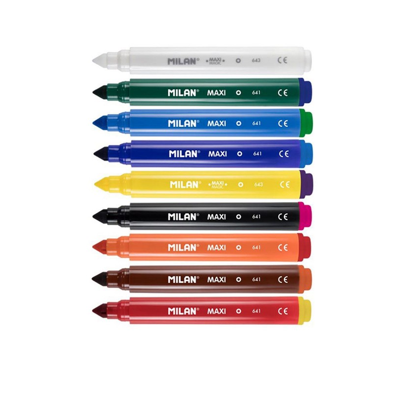 Los rotuladores maxi con punta de 7.5mm, permiten realizar trazos de 1 a 3.5mm, también es ideal para los niños pequeños. Su punta de fibra es resistente a los golpes y a la presión manual. Su tinta es a base de agua (no toxico), que proporciona colores brillantes, de fácil aplicación y mezclables entre si y se pueden lavar facilmente, cuenta con capuchon de seguridad ventilado.