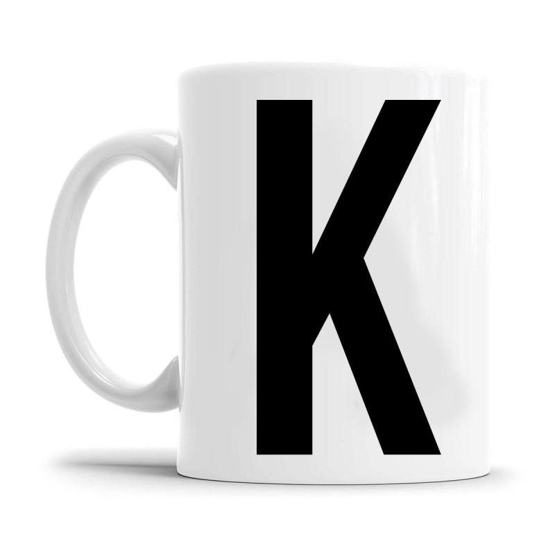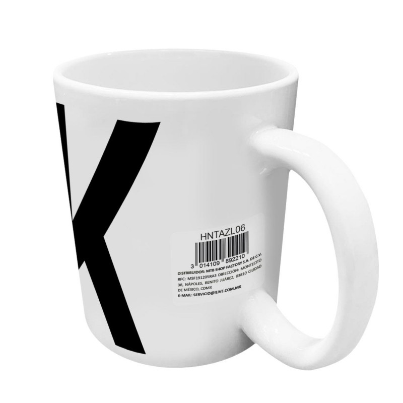 Taza clásica de cerámica con diseño de letra k en color blanco y negro, perfecta para tomar la bebida de tu preferencia, se puede meter al microondas, ideal para esos días y tardes de café, por efectos de iluminación de fotografía, el tono de color puede variar con respecto al color real.