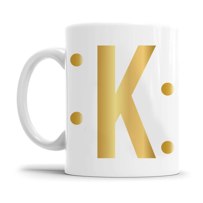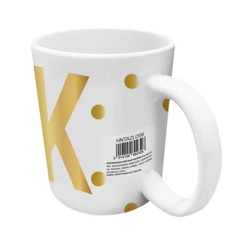 Taza clásica de cerámica con detalles de lunares y letra k en color dorado, perfecta para tomar la bebida de tu preferencia, se puede meter en microondas, ideal para esos días y tardes de café, por efectos de iluminación de fotografía, el tono de color puede variar con respecto al color real.