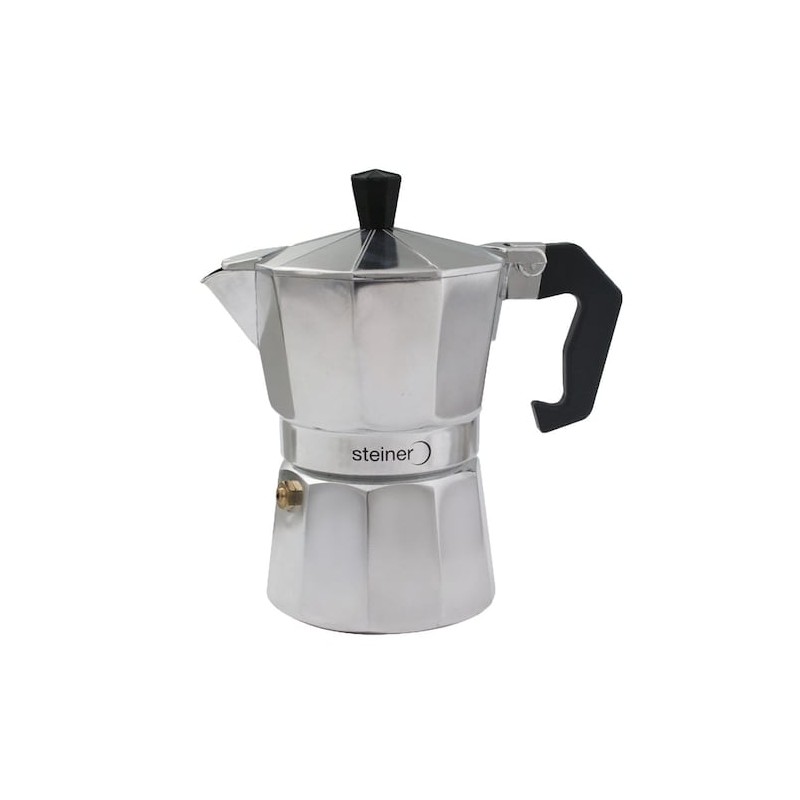 Cafetera para preparar espresso, fabricada en aluminio de alta calidad. Diseño ergonómico, mango de plástico cómodo de sostener. Cuenta con válvula de seguridad para evitar que se acumule el exceso de vapor. Fácil de limpiar. Capacidad de 3 tazas, color plata.
