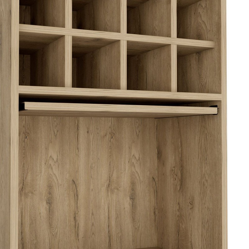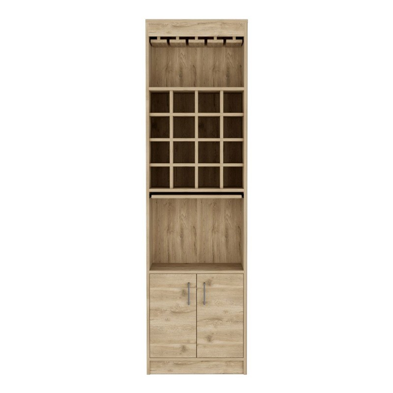 Bar kava en color duna, hecho de aglomerado de melamina de 15 mm de espesor de alta resistencia un material sustentable con el medio ambiente, con acabado mate, ideal para favorecer la utilidad y comodidad de tu sala de estar, cuenta con dieciséis espacios para organizar tus botellas de vino, dos entrepaños para colocar objetos varios, dos puertas abatibles, mesa pequeña deslizable, colgador de copas y deslizadores plásticos para muebles y una capacidad de carga general máx. aprox. del mueble 32 kg y aprox. individual por entrepaño 10 kg, la resistencia de las cargas puede variar dependiendo de cómo son distribuidos los objetos, Imagen ilustrativa, no incluye accesorios.