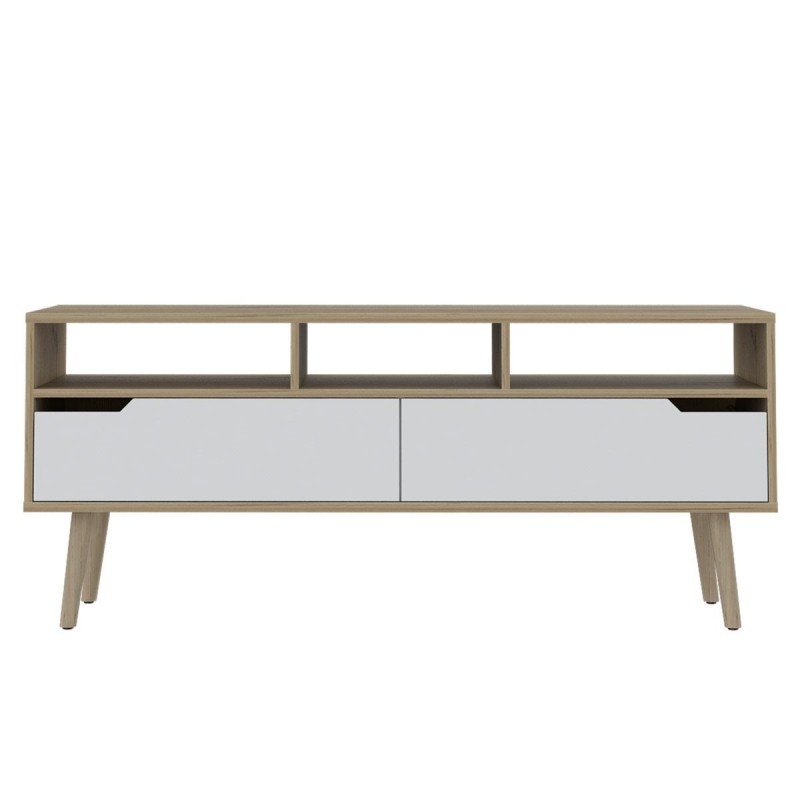 El mueble Rack de TV Oslo en color Duna Blanco es ideal para la sala o el estudio, soporta un pantalla de 60 pulgadas, color duna con dos puertas en color blanco.