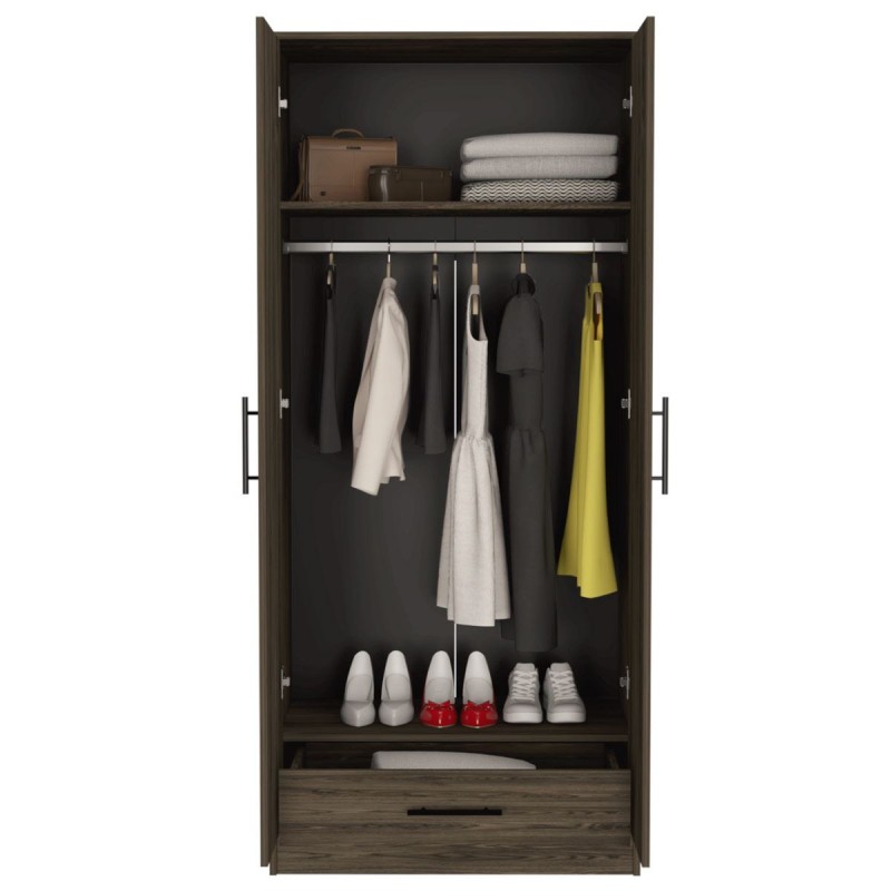 Ideal para tú recamara, este es el Armario Ambery de la marca Excelsior en color coñac, cuenta con dos puertas y dos espaciosos entrepaños, un tubo cromado para colgar la ropa y un cajón en la parte inferior para guardar tus prendas favoritas.