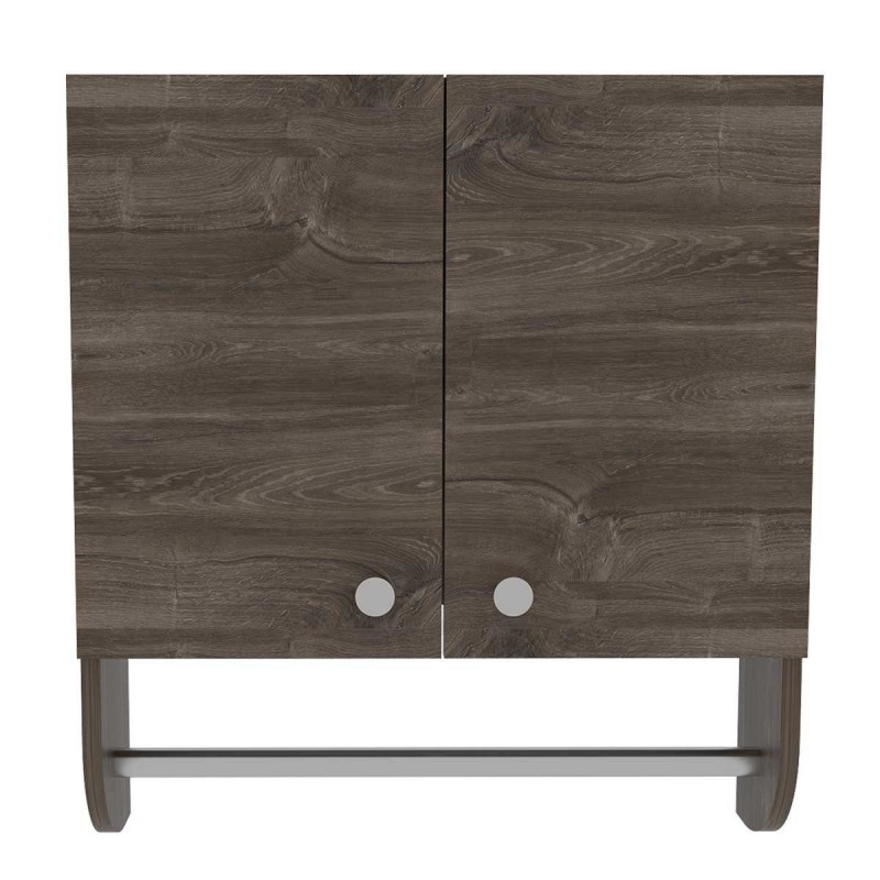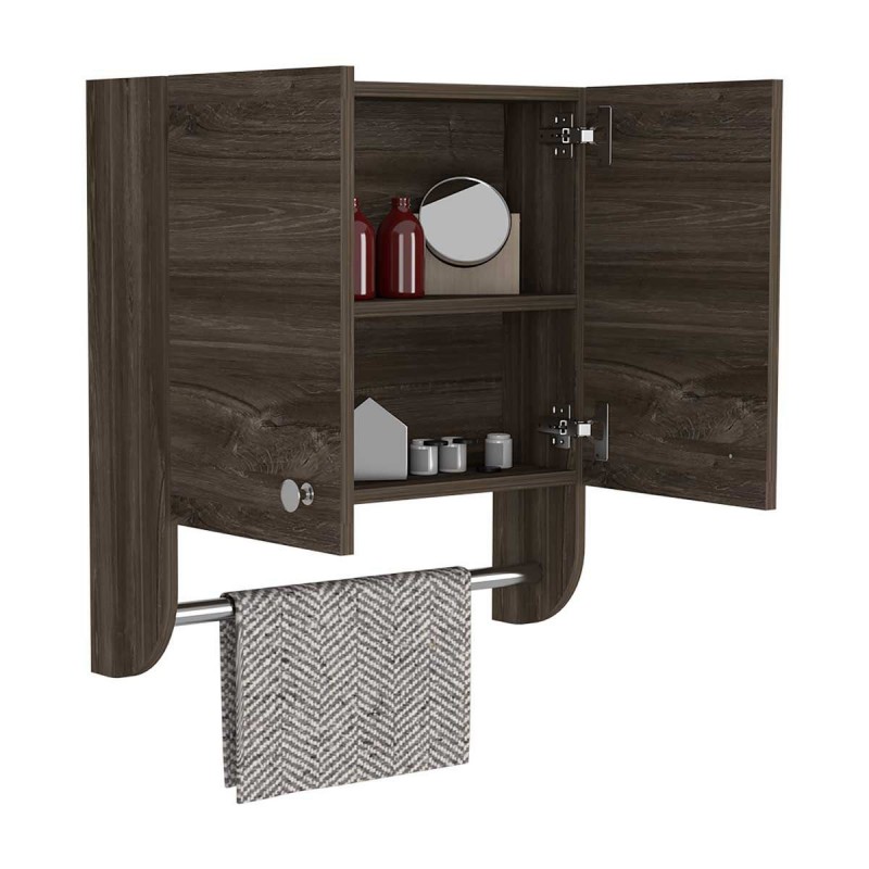 Gabinete de baño rivera en color siena, hecho de melamina de 15 mm de espesor de alta resistencia un material sustentable con el medio ambiente, con acabado mate, ideal para favorecer la utilidad y comodidad de tu baño, cuenta con dos entrepaños para organizar tus artículos de aseo personal, tubo metálico para colgar las toallas y dos puertas abatibles con manija metálica y una capacidad de carga general máx. aprox. del mueble 12 kg y aprox. individual por entrepaño 10 kg, la resistencia de las cargas puede variar dependiendo de cómo son distribuidos los objetos, Imagen ilustrativa, no incluye accesorios.