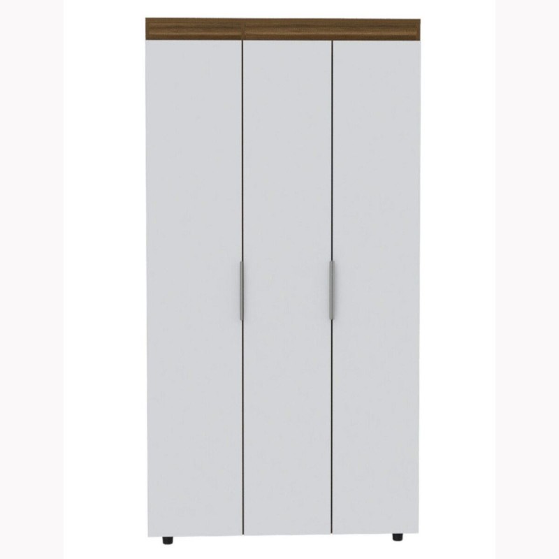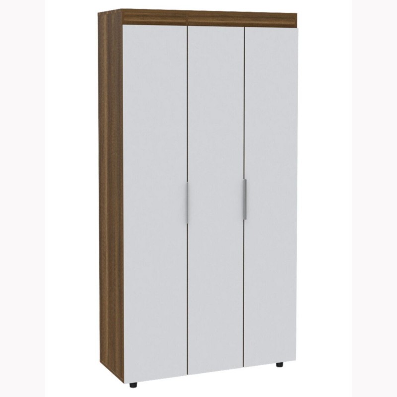 Armario Tolouse de la marca Excelsior, ideal para la recámara, en color caramelo con blanco, cuenta con tres puertas centrales abatibles, múltiples entrepaños, dos tubos cromados para colgar la ropa y un cajón interno, fácil de armar, diseño juvenil, ahorra espacio, fabricado en resistente melamina.