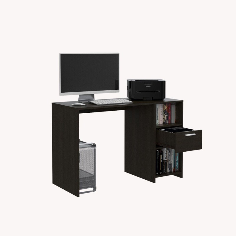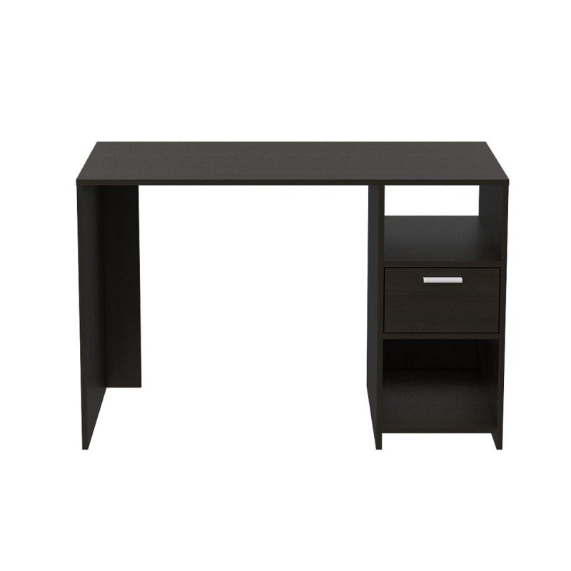 Escritorio Omma de la marca Excelsior, es ideal para la recamara o estudio, cuenta con 1 cajon, 2 entrepaños para organizar libros y mesa de trabajo, fabricado en melamina de alta resistencia con un espesor de 15 milímetros, fácil de armar, diseño moderno, ahorra espacio, en color wengue chocolate que combina con cualquier decoración. Medidas alto 73 cm, frente 110 cm, fondo 50 cm.