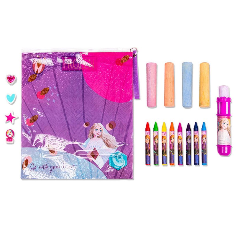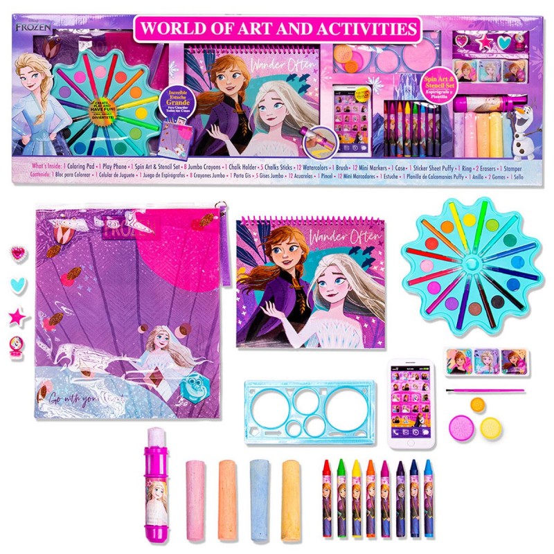 Mundo de arte y actividades 1 block para colorear con 25 hojas, 1 sujetador de gis, 5 gises jumbo, 1 planilla de calcomanías 3D, 4 gomas, 12 crayones, 8 marcadores, 10 acuarelas, 1 pincel, 3 planillas de calcomanías y 1 celular de juguete.