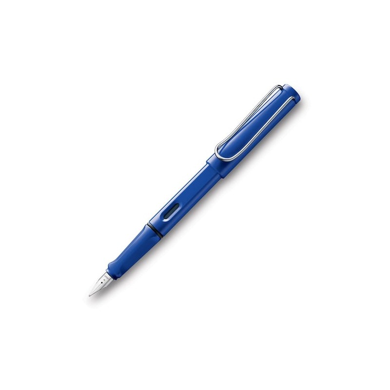 Pluma fuente de resina plástica muy resistente color azul, superficie lisa brillante, diseño exclusivo Lamy con soporte triangular frontal para una buena escritura. Plumilla de acero acabado pulido punto fino y clip cromado.