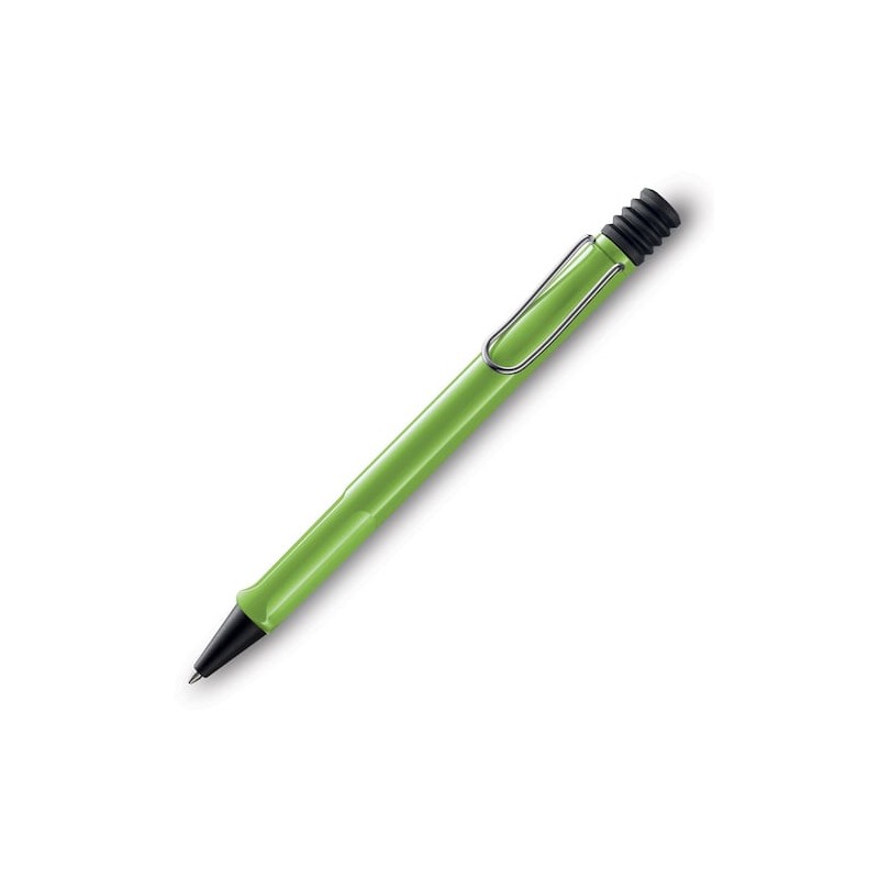 Bolígrafo LAMY safari, acabado en resina plástica resistente brillante color VERDE LIMON, empuñadura ergonómica de plástico, clip de metal, incluye repuesto LAMY M16 azul punto mediano.