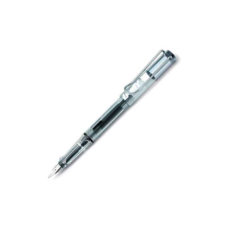 Pluma fuente de resina plástica muy resistente y completamente transparente, superficie lisa brillante, diseño exclusivo Lamy con soporte triangular frontal para una buena escritura. Plumilla de acero acabado pulido punto fino y clip cromado.