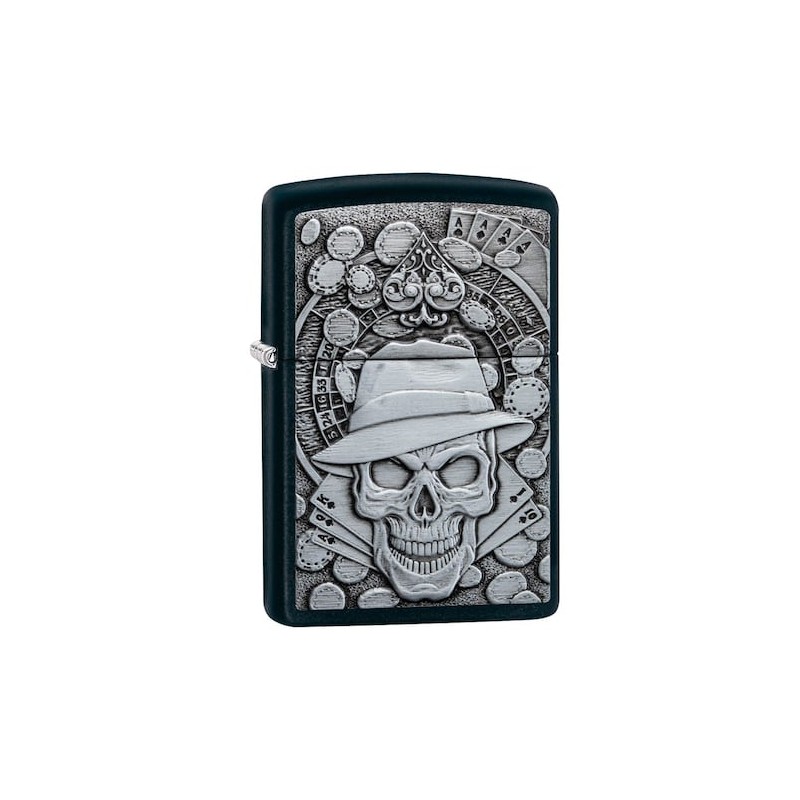 Encendedor Genuino Zippo diseño emblema craneo y juegos de azar. Recargable con gasolina Zippo, diseño compacto ideal para cargar en el bolsillo. A prueba de viento.Cuenta con Garantía de por Vida. Se surte individualmente en estuche.