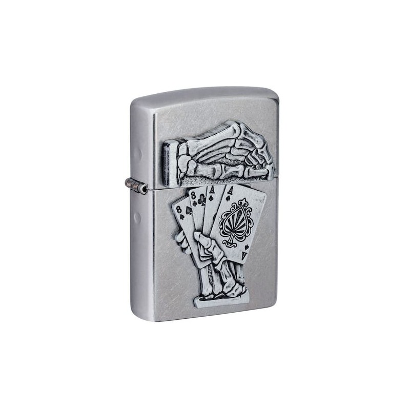 Encendedor Genuino Zippo diseño emblema cartas y manos color cromado. Recargable con gasolina Zippo, diseño compacto ideal para cargar en el bolsillo. A prueba de viento.Cuenta con Garantía de por Vida. Se surte individualmente en estuche.