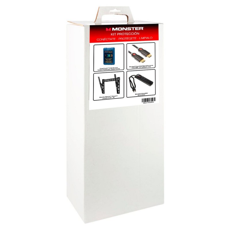 El Kit Monster TVs cuenta con un Soporte de Pantalla- Supresor de Picos- Cable HDMI- Limpiador de Pantallas. El Kit Monster TVs cuenta con todo lo que necesitas para poder disfrutar cómodamente tu Pantalla de TV respaldado por la reconocida marca Monster. Este paquete incluye un limpiador para Pantalla Clean Touch, especial para eliminar cualquier rastro de suciedad o huellas digitales de tu pantalla con la seguridad de que no contiene productos químicos que puedan dañarla. También incluye un cable HDMI de alta velocidad con una longitud de 3 metros, ideal para transmitir datos de audio y video desde tu consola de videojuegos o reproductor de Blu-Ray. Encontraras también un soporte de pared reforzado para montar tu pantalla este soporte está diseñado para pantallas de 24 a 55. Por último se añade en este kit, un Multicontacto Monster Essentials, que cuenta con 4 salidas de corriente alterna la cual protegerá tu pantalla de sobretensiones en la línea eléctrica.
